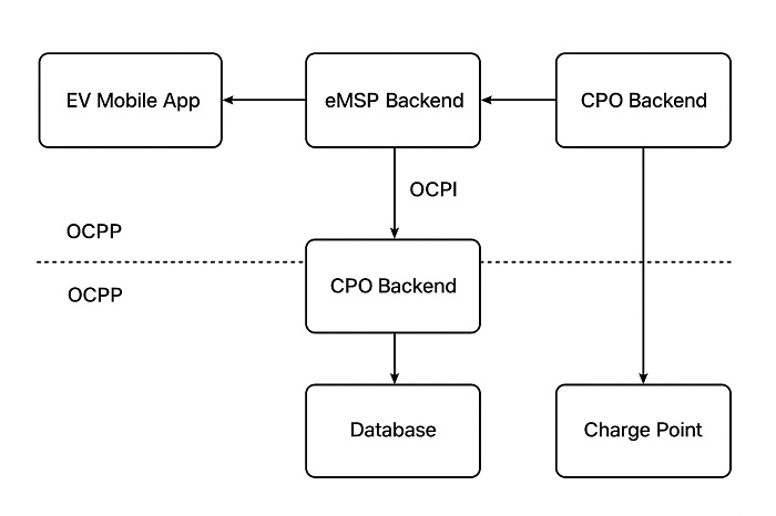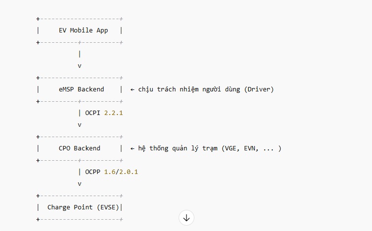 • OCPI layer: cầu nối CPO ↔ eMSP (nội bộ và đối tác ngoài).