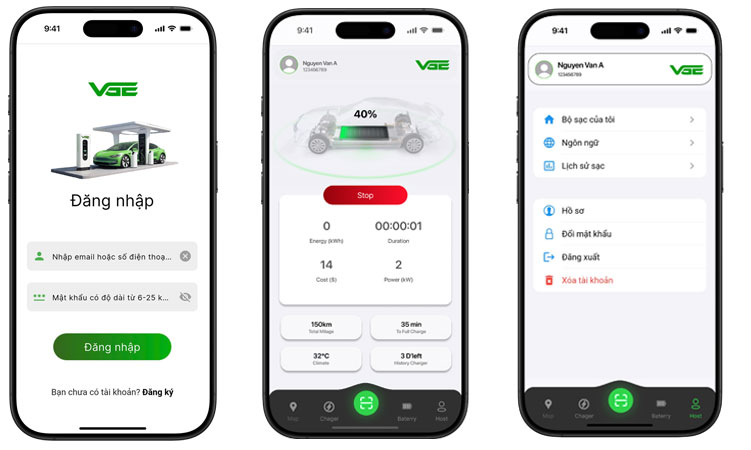 5. Bắt sạc từ app → hiển thị tốc độ, kWh, thời gian, chi phí ước tính.